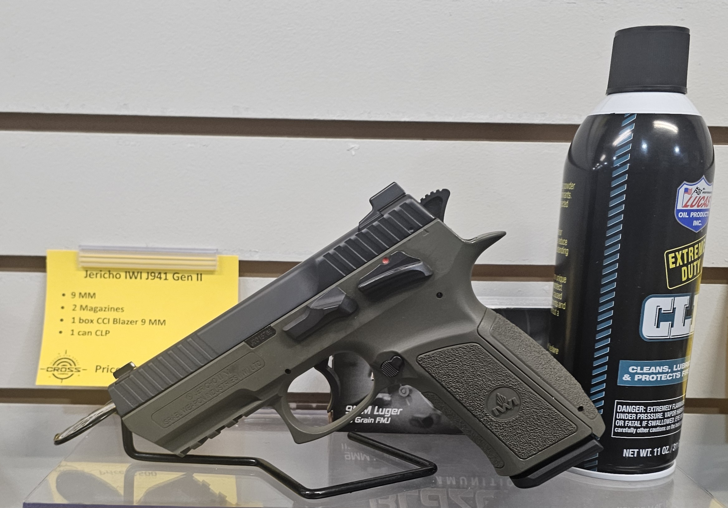 Like new but used IWI Jericho Gen II 9mm. This pistol comes as a package with two magazines, one box of CCI Blazer 9mm ammo and a can of Lucas CLP!